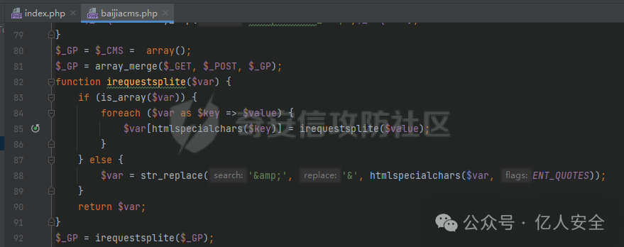 irequestsplite()函数主要是用htmlspecialchars()将预定义字符(&、<、>、"、')转换为HTML实体,防止XSS。92行对$_GP调用irequestsplite()处理,即对GET和POST传入的数据都进行处理