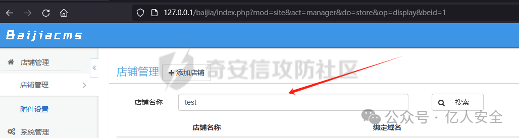 根据url定位到文件\system\manager\class\web\store.php,抓包发现接收参数为sname,搜索sname