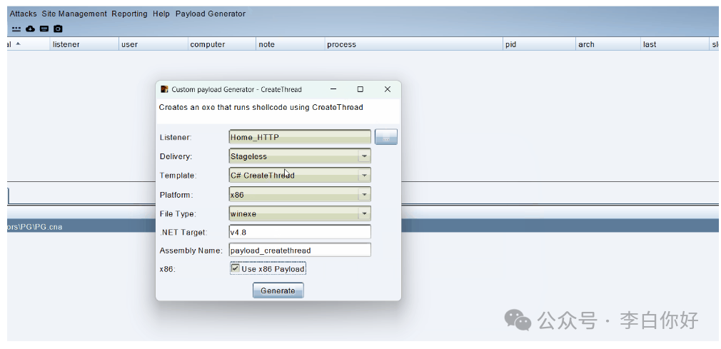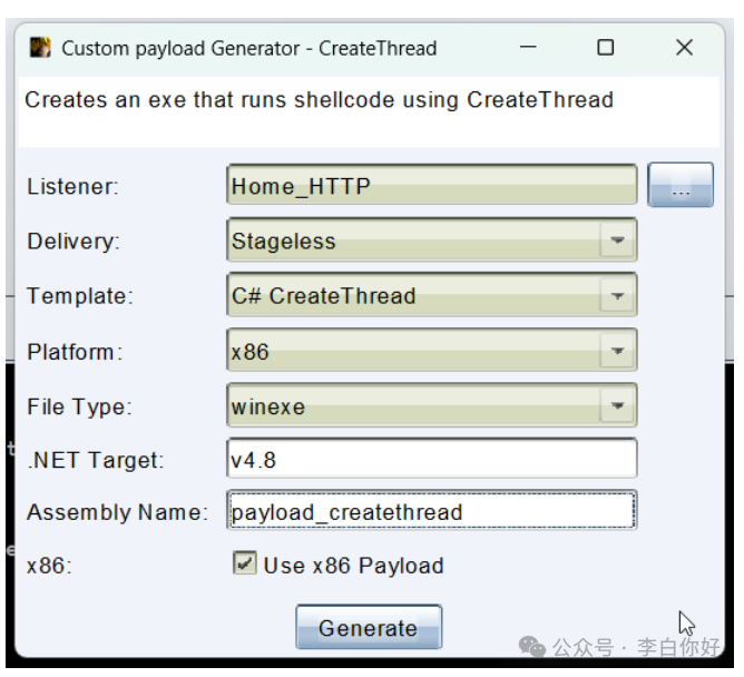 为了构建有效负载,预定值已添加到菜单选项中,因为此 API 仅适用于 x86 二进制文件,并且程序集类型为 winexe 以避免控制台弹出窗口