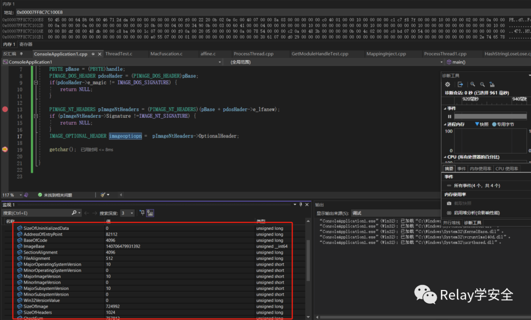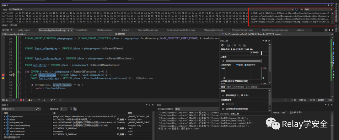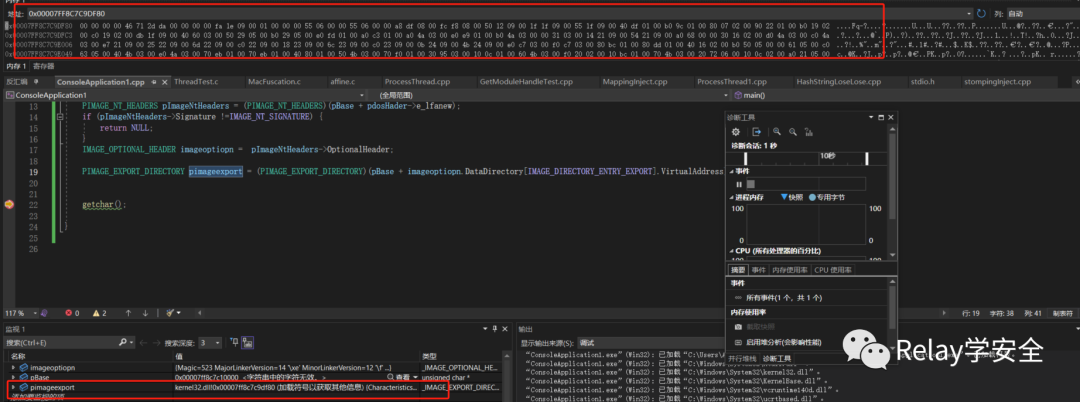 #include <iostream>#include <Windows.h>int main(){HANDLE handle = GetModuleHandle(L"kernel32.dll");PBYTE pBase = (PBYTE)handle;PIMAGE_DOS_HEADER pdosHader = (PIMAGE_DOS_HEADER)pBase;if(pdosHader->e_magic != IMAGE_DOS_SIGNATURE) {return NULL;}PIMAGE_NT_HEADERS pImageNtHeaders = (PIMAGE_NT_HEADERS)(pBase + pdosHader->e_lfanew);if (pImageNtHeaders->Signature !=IMAGE_NT_SIGNATURE) {return NULL;}IMAGE_OPTIONAL_HEADER imageoptiopn = pImageNtHeaders->OptionalHeader;PIMAGE_EXPORT_DIRECTORY pimageexport = (PIMAGE_EXPORT_DIRECTORY)(pBase + imageoptiopn.DataDirectory[IMAGE_DIRECTORY_ENTRY_EXPORT].VirtualAddress);getchar();}