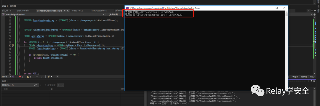 #include <iostream>#include <Windows.h>#include <winternl.h>HMODULE GetModuleHandleRelaysec(IN LPCWSTR szModuleName) {//获取PEB结构#ifdef _WIN64PPEB pPeb = (PEB*)(__readgsqword(0x60));#elif _WIN32PPEB pPeb = (PEB*)(__readfsdword(0x30));#endif//获取LdrPPEB_LDR_DATA pLdr = (PPEB_LDR_DATA)(pPeb->Ldr);//获取链表中包含关于第一给模块信息的第一个元素。PLDR_DATA_TABLE_ENTRY pDte = (PLDR_DATA_TABLE_ENTRY)(pLdr->InMemoryOrderModuleList.Flink);//由于每个pDte在链表中都代表一个唯一的DLL,所以可以使用以下一行代码访问下一个元素。while (pDte) {if (pDte->FullDllName.Length !=NULL) {wprintf(L" \"%s\"\n", pDte->FullDllName.Buffer);}else {break;}pDte = *(PLDR_DATA_TABLE_ENTRY*)(pDte);}return NULL;}int main(){GetModuleHandleRelaysec(L"kernel32.dll");}