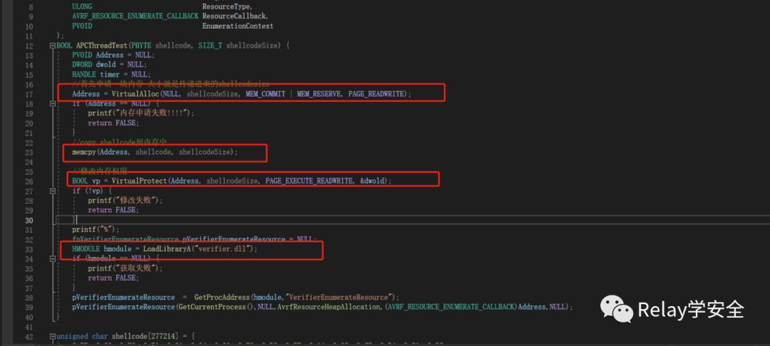比如如下代码是一个APC注入的代码,里面用到了VirtualAlloc,memcpy,LoadLibraryA等函数。