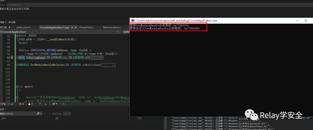 BOOL StringEq(IN LPCWSTR s1, IN LPCWSTR s2) {WCHAR lStr1[MAX_PATH],lStr2[MAX_PATH];int len1 = lstrlenW(s1),len2 = lstrlenW(s2);int i = 0,j = 0;if (len1 >= MAX_PATH || len2 >= MAX_PATH)return FALSE;for (i = 0; i < len1; i++) {lStr1[i] = (WCHAR)tolower(s1[i]);}lStr1[i++] = L'\0';for (j = 0; j < len2; j++) {lStr2[j] = (WCHAR)tolower(s2[j]);}lStr2[j++] = L'\0';if (lstrcmpiW(lStr1, lStr2) == 0)return TRUE;return FALSE;}HMODULE GetModuleHandleRelaysec(IN LPCWSTR szModuleName) {//获取PEB结构#ifdef _WIN64PPEB pPeb = (PEB*)(__readgsqword(0x60));#elif _WIN32PPEB pPeb = (PEB*)(__readfsdword(0x30));#endif//获取LdrPPEB_LDR_DATA pLdr = (PPEB_LDR_DATA)(pPeb->Ldr);//获取链表中包含关于第一给模块信息的第一个元素。PLDR_DATA_TABLE_ENTRY pDte = (PLDR_DATA_TABLE_ENTRY)(pLdr->InMemoryOrderModuleList.Flink);//由于每个pDte在链表中都代表一个唯一的DLL,所以可以使用以下一行代码访问下一个元素。while (pDte) {if (pDte->FullDllName.Length != NULL) {if (StringEq(pDte->FullDllName.Buffer, szModuleName)) {#ifdef STRUCTSreturn (HMODULE)(pDte->InMemoryOrderLinks.Flink);#elsereturn (HMODULE)(pDte->Reserved2[0]);#endif}}else {break;}pDte = *(PLDR_DATA_TABLE_ENTRY*)(pDte);}return NULL;}