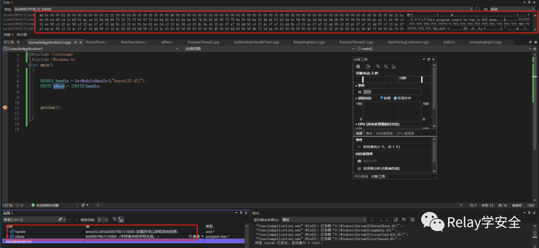 #include <iostream>#include <Windows.h>int main(){HANDLE handle = GetModuleHandle(L"kernel32.dll");PBYTE pBase = (PBYTE)handle;PIMAGE_DOS_HEADER pdosHader = (PIMAGE_DOS_HEADER)pBase;if(pdosHader->e_magic != IMAGE_DOS_SIGNATURE) {return NULL;}getchar();}