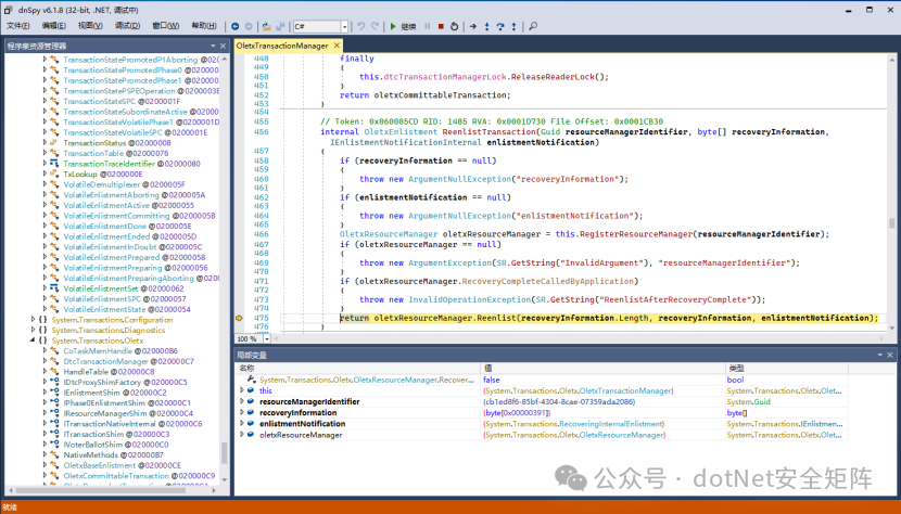 从图上调试显示进入核心方法 “oletxResourceManager.Reenlist”,内部调用了BinaryFormatter格式化器 formatter,用于反序列化恢复事务对象信息,也因此加载恶意的攻击载荷触发了反序列化漏洞。