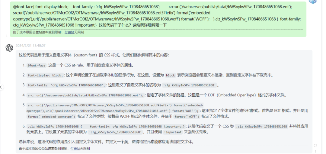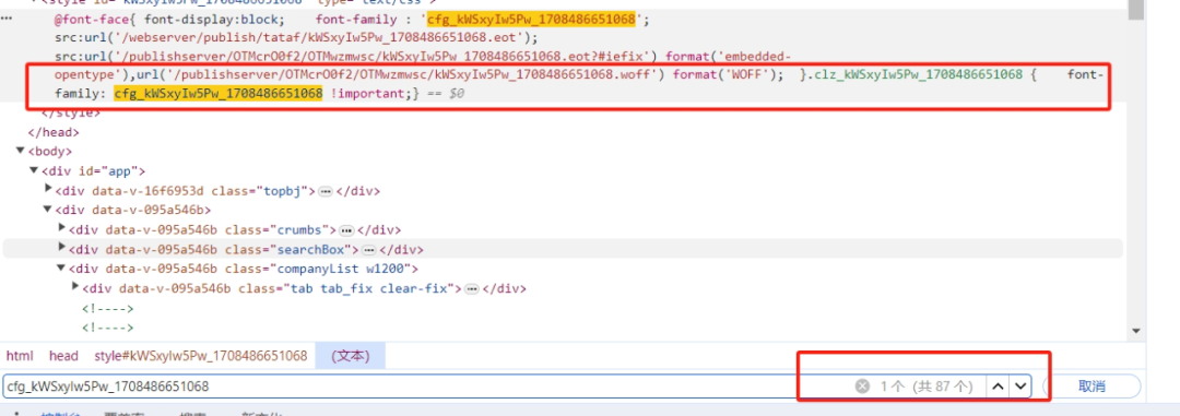 GPT 给出的解释是:主要用于定义字体的 css 样式,并且指定了字体文件的路径(主域名+路径+.woff 后缀),然后定义了一个 css 类,并且设置了元素的字体族为 cfg_kWSxyIw5Pw_1708486651068,所以它是靠引入外部 woff 文件来给字体设置样式的,同时在外部文件名中,我们发现有时间戳,因此,很大概率它是一个动态 woff 解析。