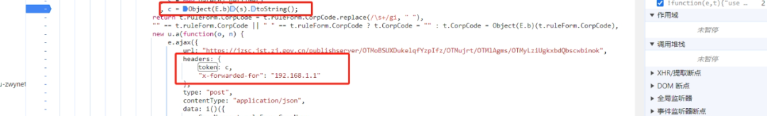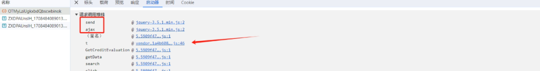 查询接口中存在 Token 参数加密,打开启动器,查看堆栈,这里教大家一个快速定位的办法,发现前俩个是 Ajax 请求,我们从第三个堆栈直接进入: