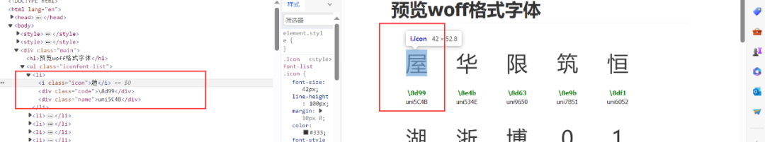 所以,现在就形成了一个在指定 woff 文件下的映射关系,看清楚是指定 woff。在当前 woff 文件下,趙字代表的 code 就是 \8d99(其中 8d99 为编码编码值)代表的 name 就是 uni5C4B (其中 uni 表示它使用的是 Unicode 编码,5C4B 为编码值)。