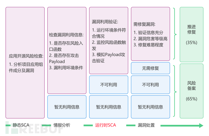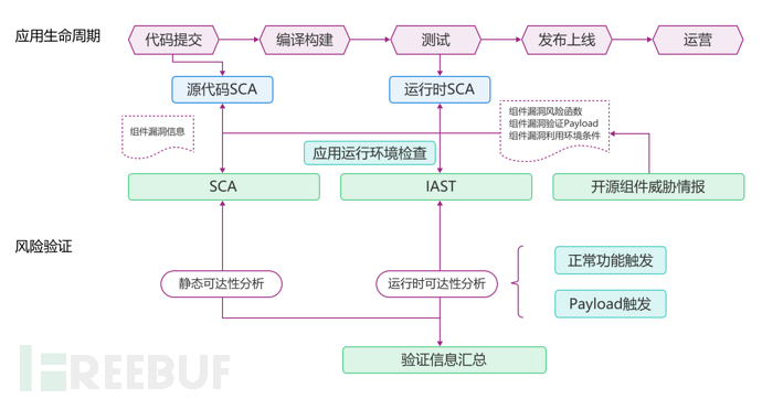 如下图所示,将源码 SCA 工具与运行时 SCA 相结合,覆盖应用从编码、测试、上线运行多个阶段,配合供应链安全情报预警,实现漏洞利用可达性验证闭环。