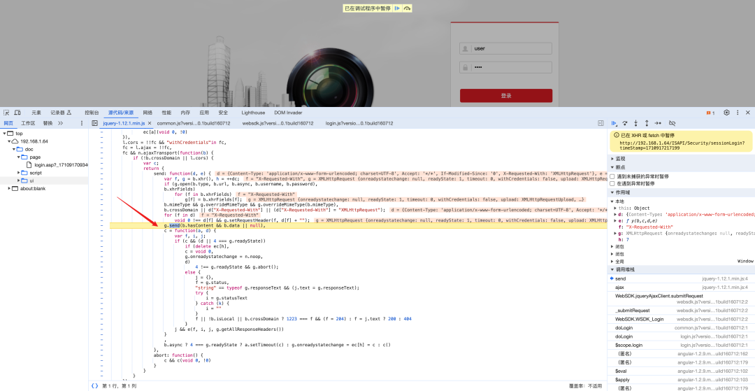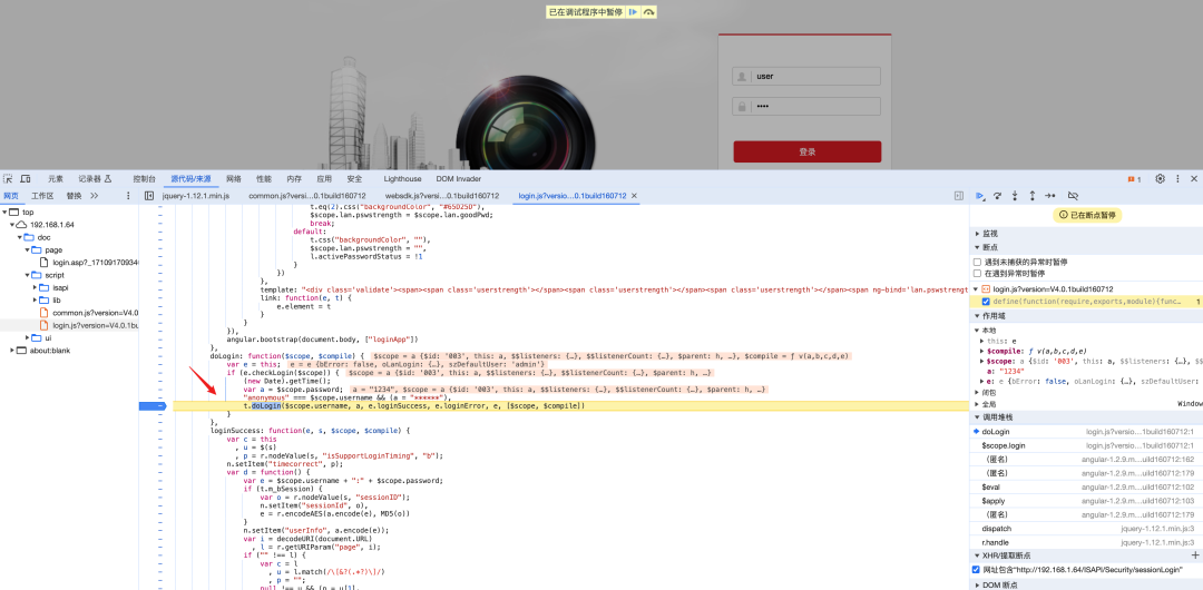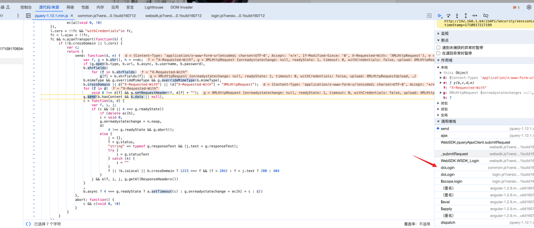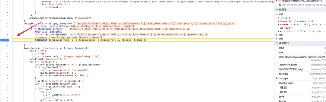 可以看到在这个 doLogin 处出现了我们的明文密码 1234 ,我们在此添加断点
