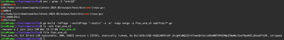 go build -ldflags '-extldflags "-static" -s -w' -tags netgo -o frpc_arm_v5 cmd/frpc/*.go