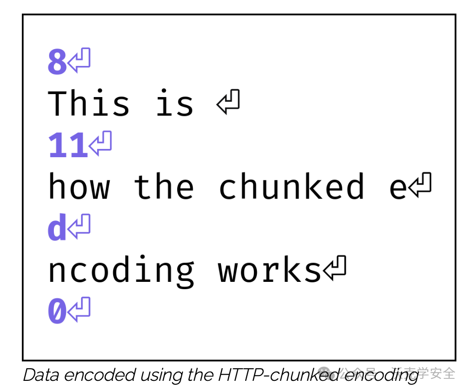 HTTP-chunked编码通过数据块(非堆内存块)发送数据。它先发送一个以十六进制表示的大小,紧接着是一个换行符,然后是相应大小的数据块,再接一个换行符。接着发送另一个大小、另一个数据块、再一个大小、又一个数据块,并通过发送大小为0(零)来指示数据的结束,如图示: