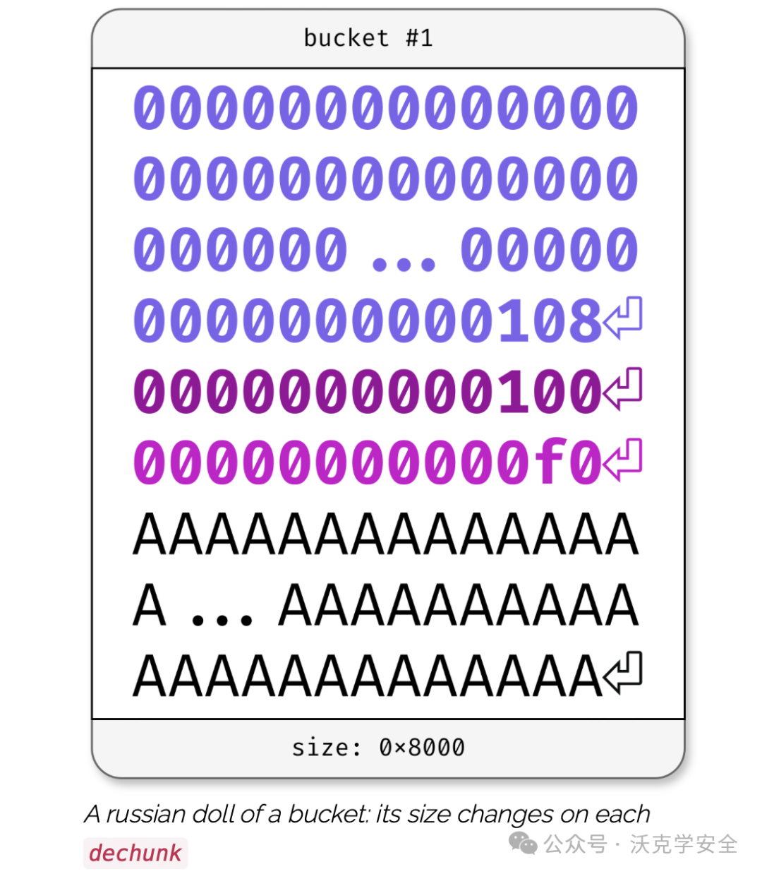 那么为了得到任意大小的bucket,我们应在每个bucket的前面先填充成千上万个零,然后提供一个大小和数据块,如下所示: