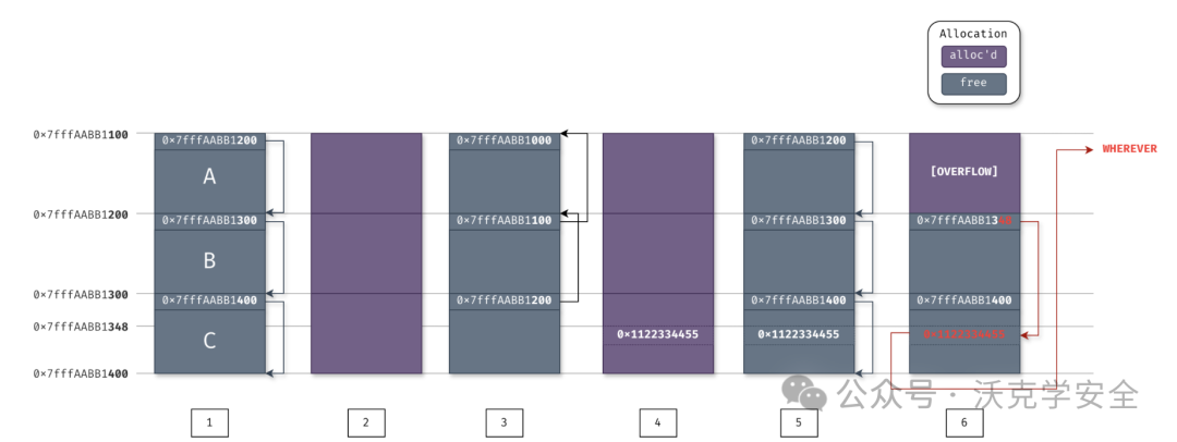 为了便于描述将大小为0x100的块的空闲列表命名为FL[0x100],假设已经通过分配大量0x100大小的块成功填充了堆。因此,在内存中的某个位置,必有三个连续的空闲块A、B和C,其中A是FL[100]的头。A指向B,B指向C(步骤1)。我们可以分配这三个块(步骤2),然后再次释放它们(步骤3)。此时,空闲列表被反转:我们得到的是C→B→A。接着我们再次进行分配,但这次我们在C的偏移量0x48处放置了一个任意指针0x1122334455(步骤4)。再次释放它们(步骤5)后,状态与步骤1完全相同,但有一个小差异:在C+0x48处存在一个任意指针。现在我们可以从块A执行溢出操作,这将改变B中包含的指针的位置。它现在指向了C+0x48的位置,结果使得空闲列表变为 B→ C+0x48 → 0x1122334455。再进行 3 次分配,就可以让 PHP 分配在我们的任意地址。于是拥有了一个“写入任意位置”的功能。