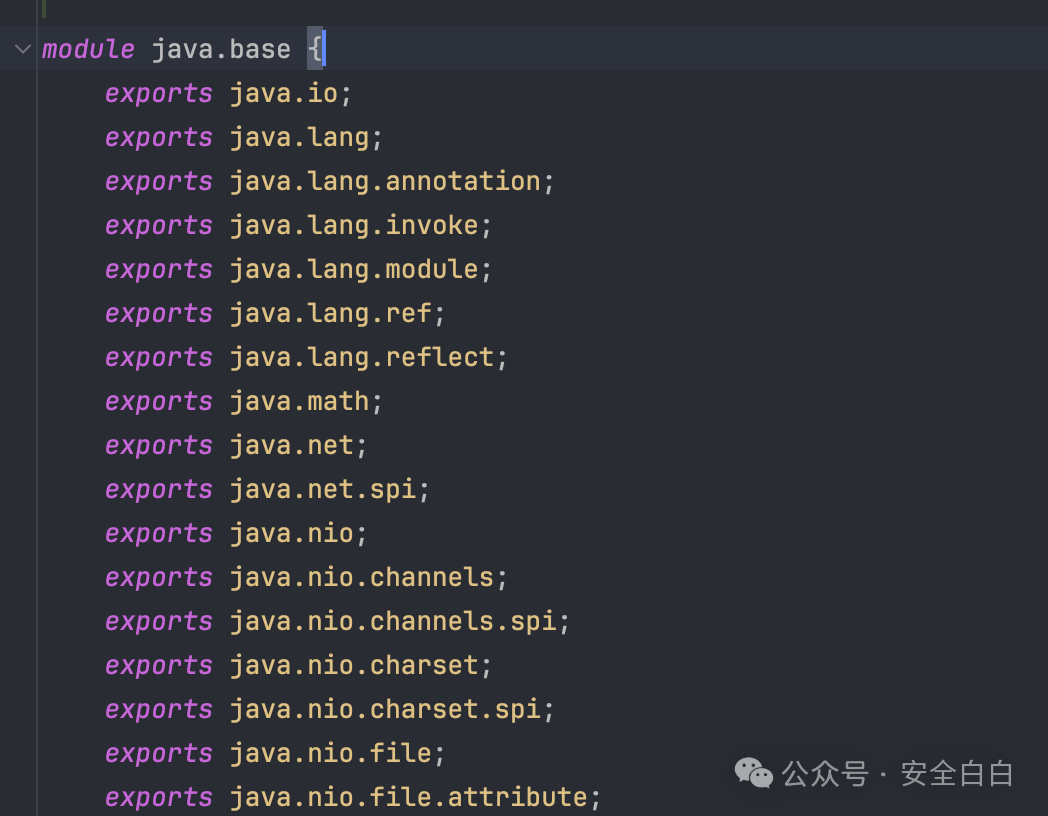 也就是说JDK17+在开发的时候并没有将我们所需要的java.lang开放反射权限,导致我们无法进行反射类加载,查看JDK源码中的module-info.class定义,发现确实没有使用open指令