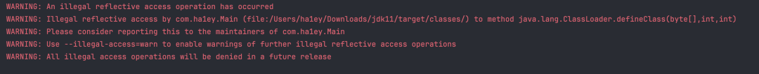 使用上述demo运行后会提示非法反射操作,并且会提示在未来的版本会完全禁用掉此类的不安全反射操作,但是不影响字节码的加载