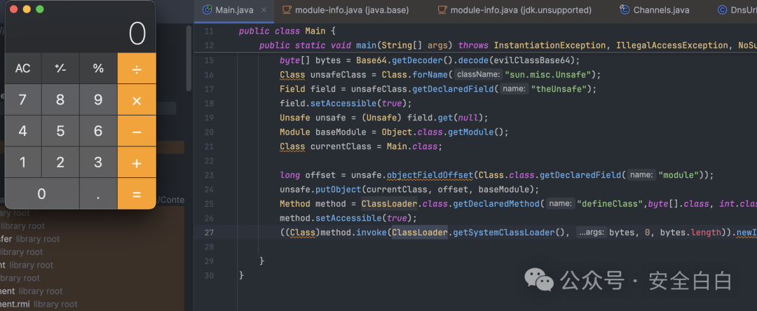 unsafe.defineAnonymousClass(Class.class,bytes,null).newInstance();虽然JDK模块化后官方预留了sun.misc和sun.reflect两个包可以进行反射调用,但是JDK17+同时也删掉了Unsafe的defineAnonymousClass方法。这就导致前面的加载方式就失效了。