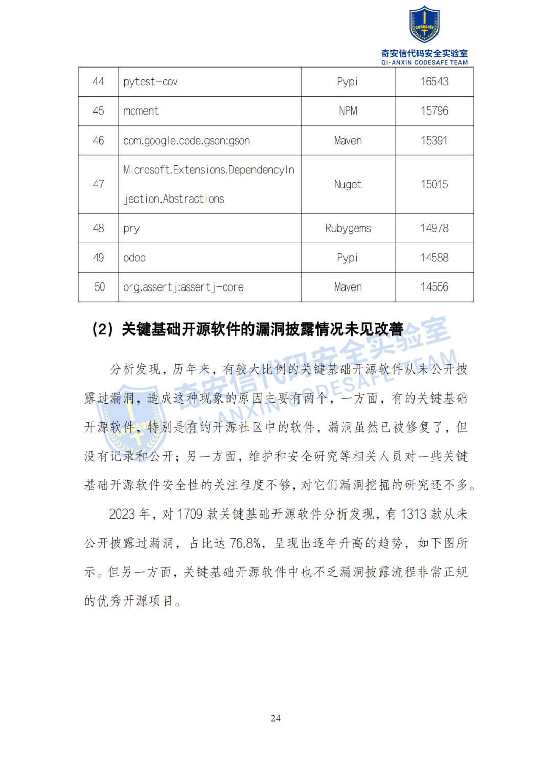 2024年8月12日,奇安信集团对外发布《2024中国软件供应链安全分析报告》(以下简称《报告》)。《报告》显示,国内企业软件项目,开源软件使用率达100%。目前,开源软件漏洞指标仍处于高位,软件供应链的安全问题并没有得到根本性的改善,20多年前的开源软件漏洞仍然存在于多个软件项目中。《报告》建议,软件供应链安全保障应加强顶层设计,持续推进和落地相关保护工作。