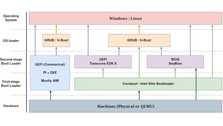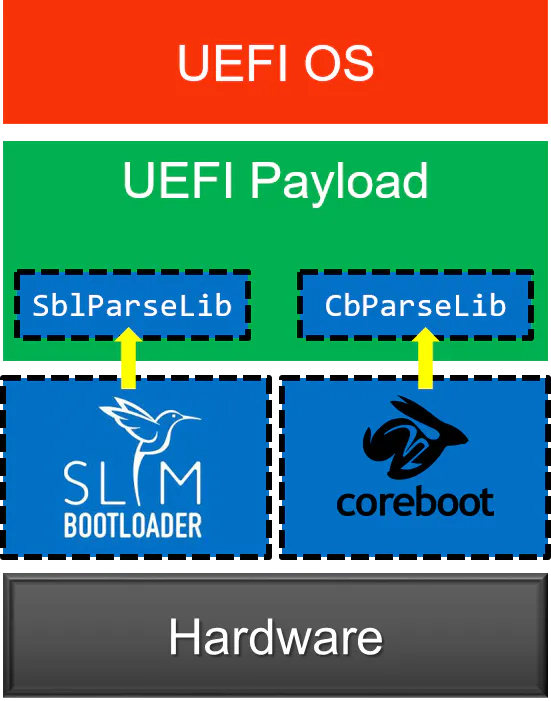 To support different First-Stage Bootloaders and provide a UEFI interface, the UEFI Payload project is used. It relies on the initial setup done and platform information provided by boot firmware to prepare the system for the UEFI environment.