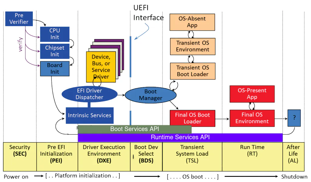 ExitBootServices() call.This process and its execution phases are covered by the UEFI Platform Initialization (PI) Specification. However, there is also the UEFI Interface (indicated by the bold blue line in the picture), which is not part of the previous document and is described in the UEFI Specification. Although the names and frequent use of UEFI can be confusing, these two documents have different focuses: