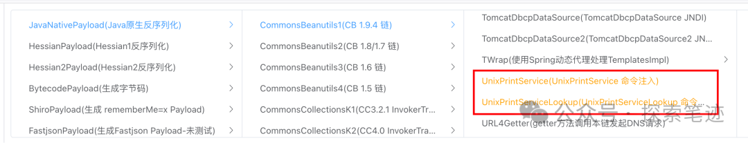 这个工具提供了较高的自由度,那么代价是什么呢?我们回顾以往的反序列化链,经常由于链子中某一环的特殊性,会导致某个 Gadget 无法使用,这样生成的链无法正常执行。例如在 Hessian 反序列化中,因为不走 readObject 函数,导致无法还原TemplatesImpl 中的 _tfactory 字段,也就无法正常使用 TemplatesImpl Gadget。同样是通过 getter 方法触发 UnixPrintService 链实现命令注入,但是由于 UnixPrintService 类是没有实现 Serializable 接口的,所以只适用于 Hessian 等反序列化,无法用于 Java 原生反序列化中。