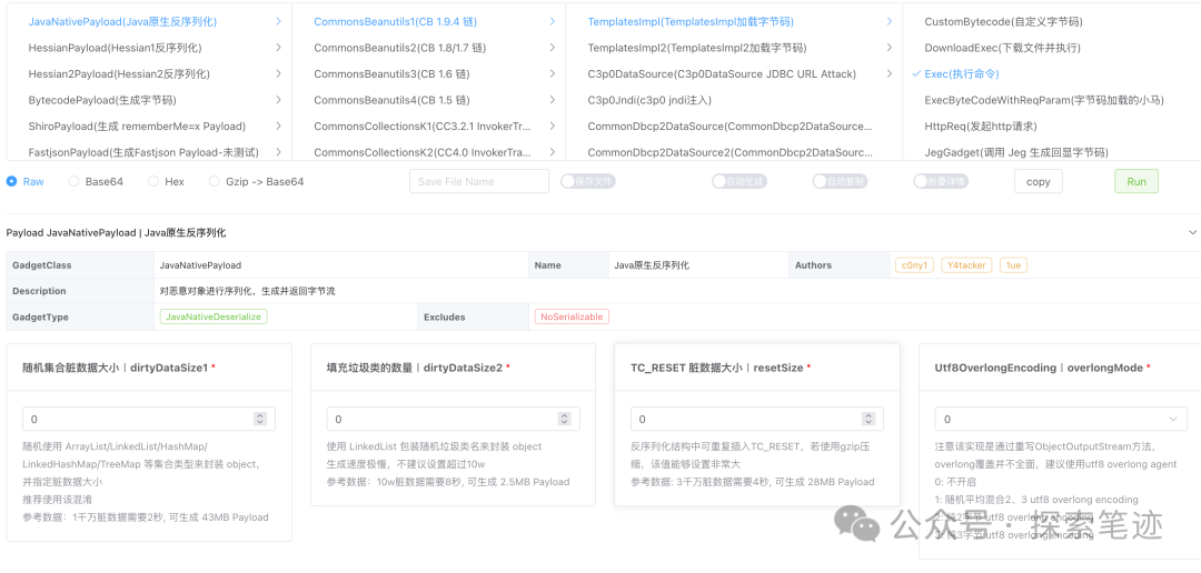 另外可以给 Payload、Gadget 设置各种参数,比如可以在Java原生反序列化中同时提供各种混淆: