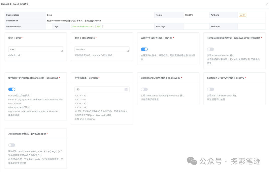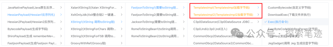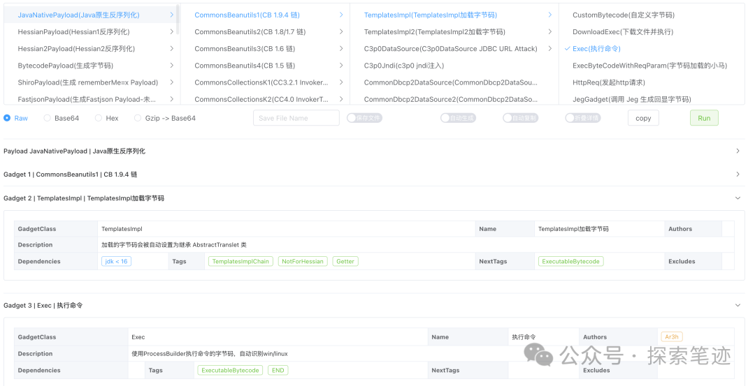 比如在字节码中,提供各种字节码格式支持,有些选项会通过链的上下文自动设置:TemplatesImpl 链中字节码需要继承 AbstractTranslet 类的,当选择了 TemplatesImpl 链就会自动处理字节码。