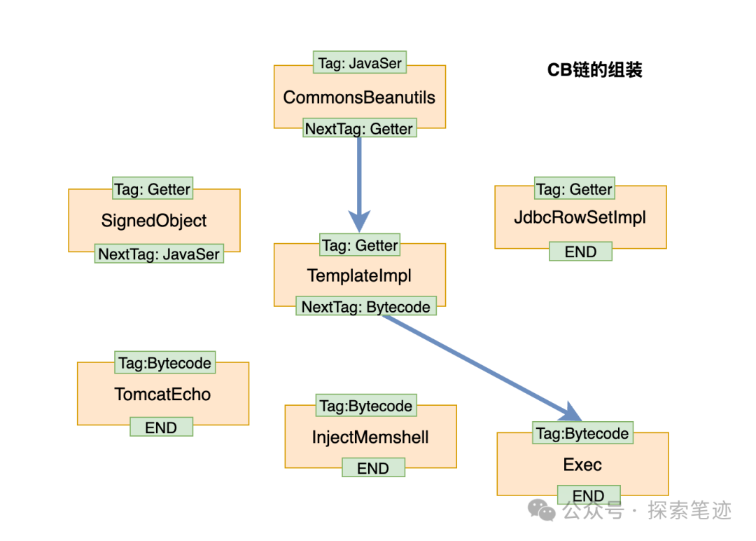 笔者的想法给 Gadget 进行贴标签,每个 Gadget 有三种标签:当前标签(Tags)、下个标签(NextTags)、排除标签(Excludes)。链子之间使用标签进行衔接,Payload 为起点,Gadget END 标签为终点,整个组装就像一个单向链表数据结构,CB链的组装如下图所示: