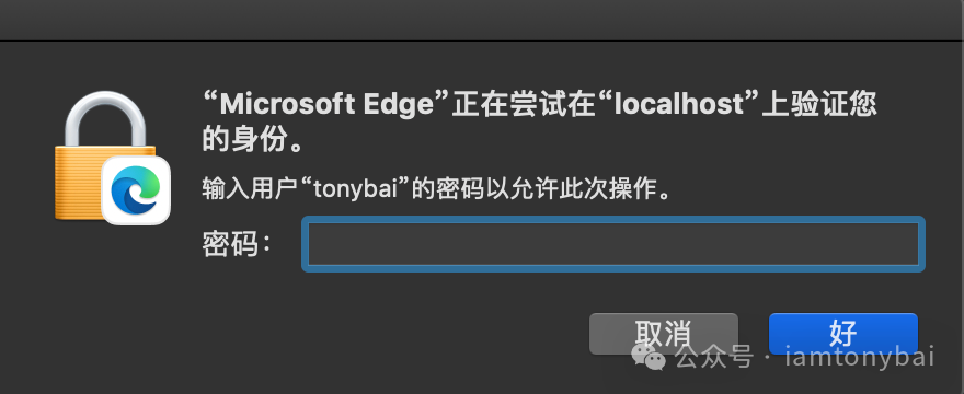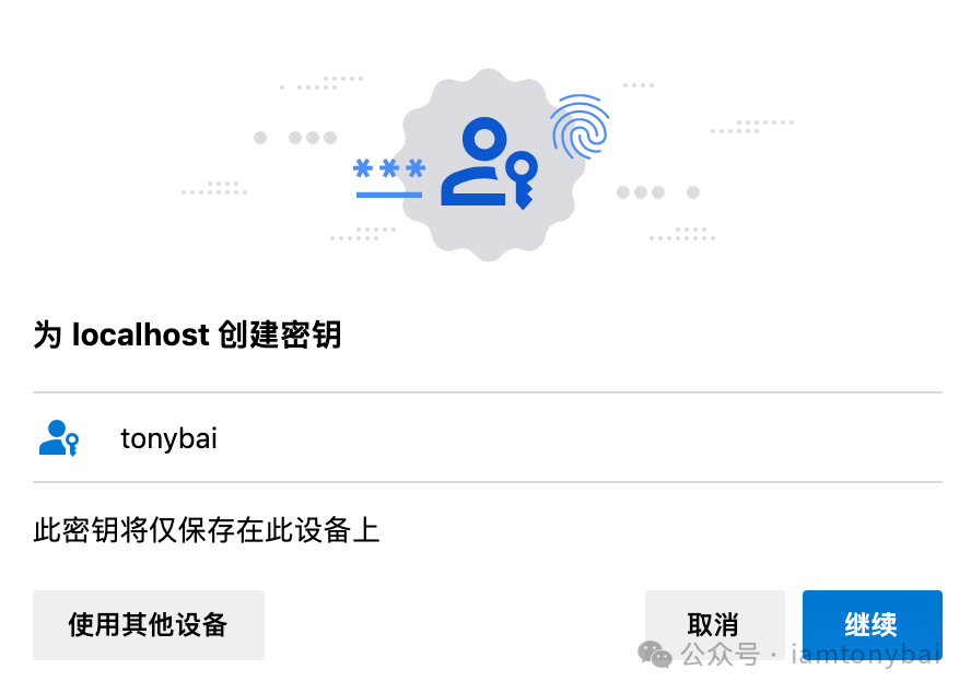 接下来,我们先来注册一个用户的passkey。在注册输入框中输入"tonybai",点击“注册”,浏览器会弹出下面对话框,提醒用户将为localhost创建密钥:
