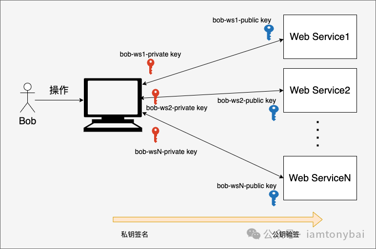 从技术本质来说,paaskey就是“免密登录服务器”方案在Web服务和终端App领域的应用。没错!passkey就是基于非对称加密实现的一种无密码认证技术。下图展示了Bob这个用户登录不同Web服务时使用不同passkey的情景: