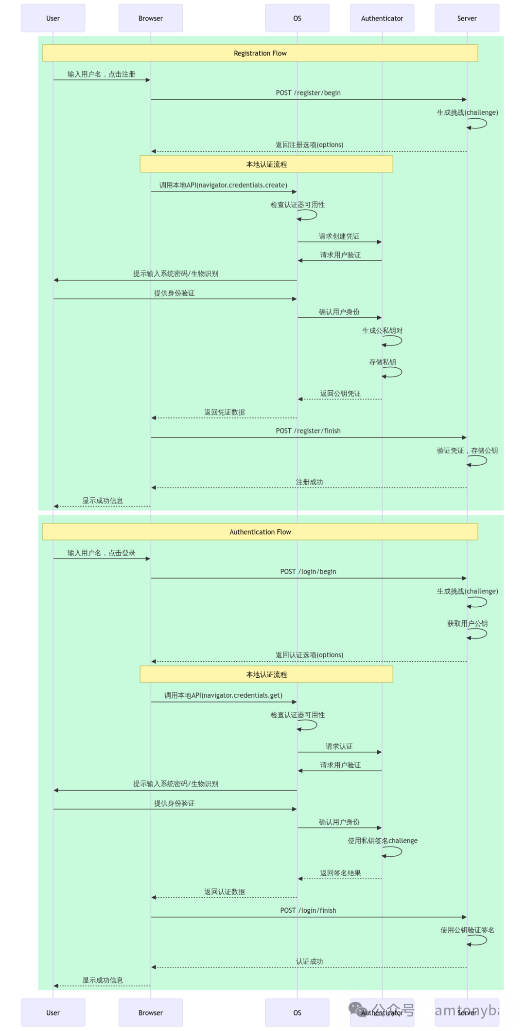 上图展示了Passkey的工作流程,包括注册和认证两个主要流程。