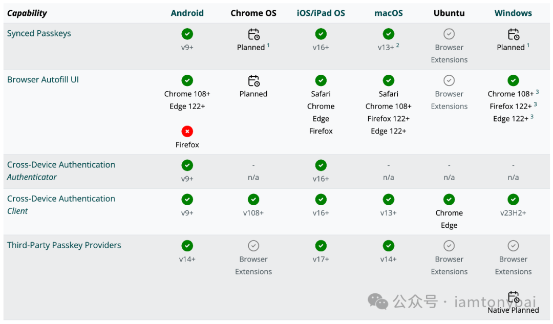 Passkey是FIDO联盟的首个无密码身份认证凭据方案,支持用户通过与解锁手机、平板或计算机相同的方式(如生物识别(比如屏幕指纹、面部识别等)、PIN码或图案)登录应用程序和网站。目前许多主流设备、操作系统原生应用、浏览器和站点都支持passkey技术(如下图),这使得passkey技术在未来的无密码认证认证领域展现出巨大的潜力。