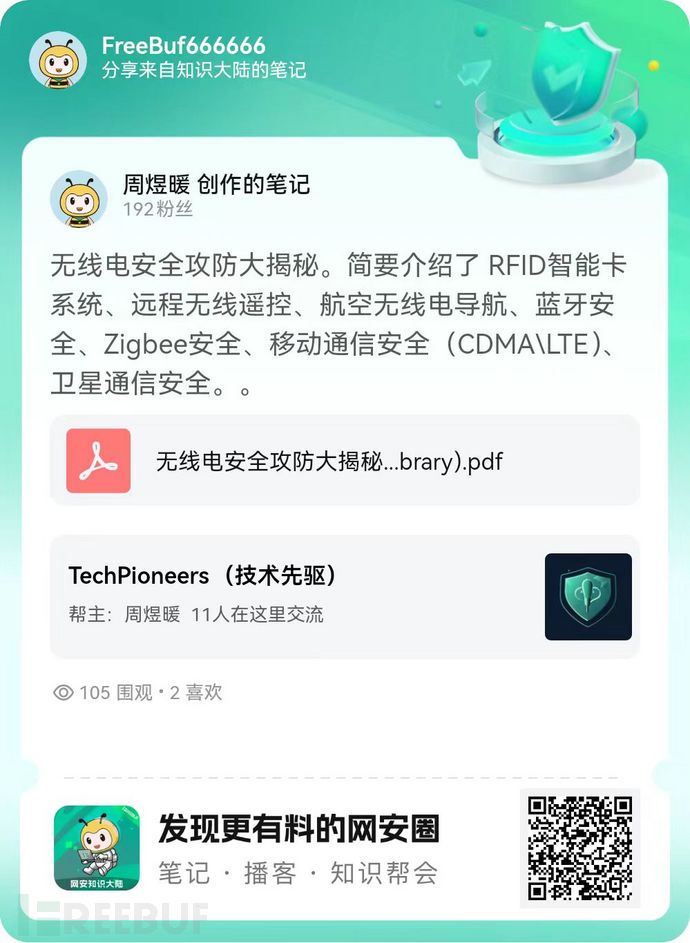 本文档简要介绍了 RFID智能卡系统、远程无线遥控、航空无线电导航、蓝牙安全、Zigbee安全、移动通信安全(CDMA\LTE)卫星通信安全。