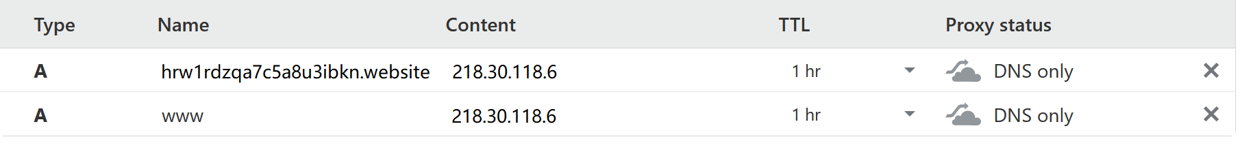 点一下云朵,确保云是灰色的(DNS only)。橘色云朵表示此解析记录使用CDN,灰色云朵表示不使用 CDN,点击云朵可以切换。这里不要使用CDN,否则接下来的配置会出问题。