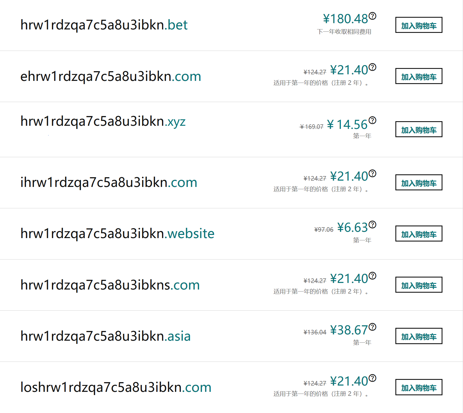 可以看到不同后缀的域名价格差别很大,通常.com .net这类域名比较昂贵.website,.site,.rocks,.xyz价格较低,选一个最便宜的。这里我们选www.hrw1rdzqa7c5a8u3ibkn.website,这个域名一年不到7块钱。如果你购买时发现价格贵一些也是正常的,域名首年的价格通常不到10块钱。