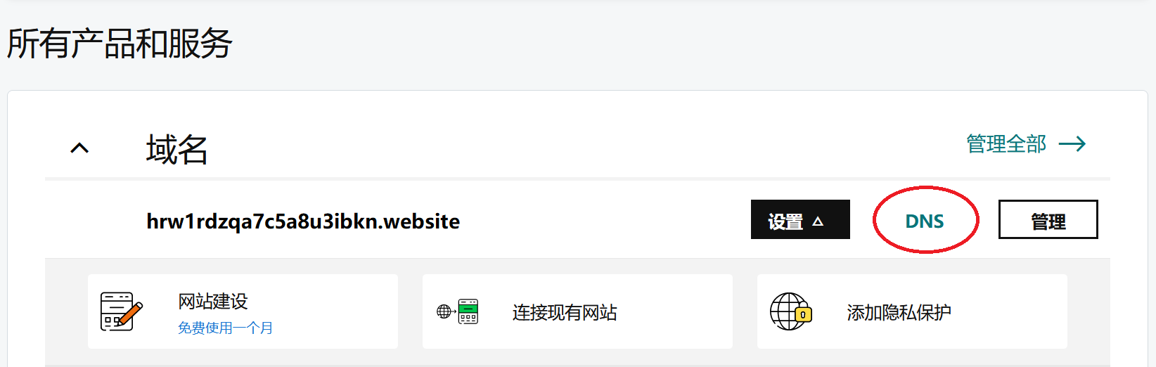 这里可以看到你拥有的域名,点击域名旁边的【DNS】,进入DNS管理页面。
