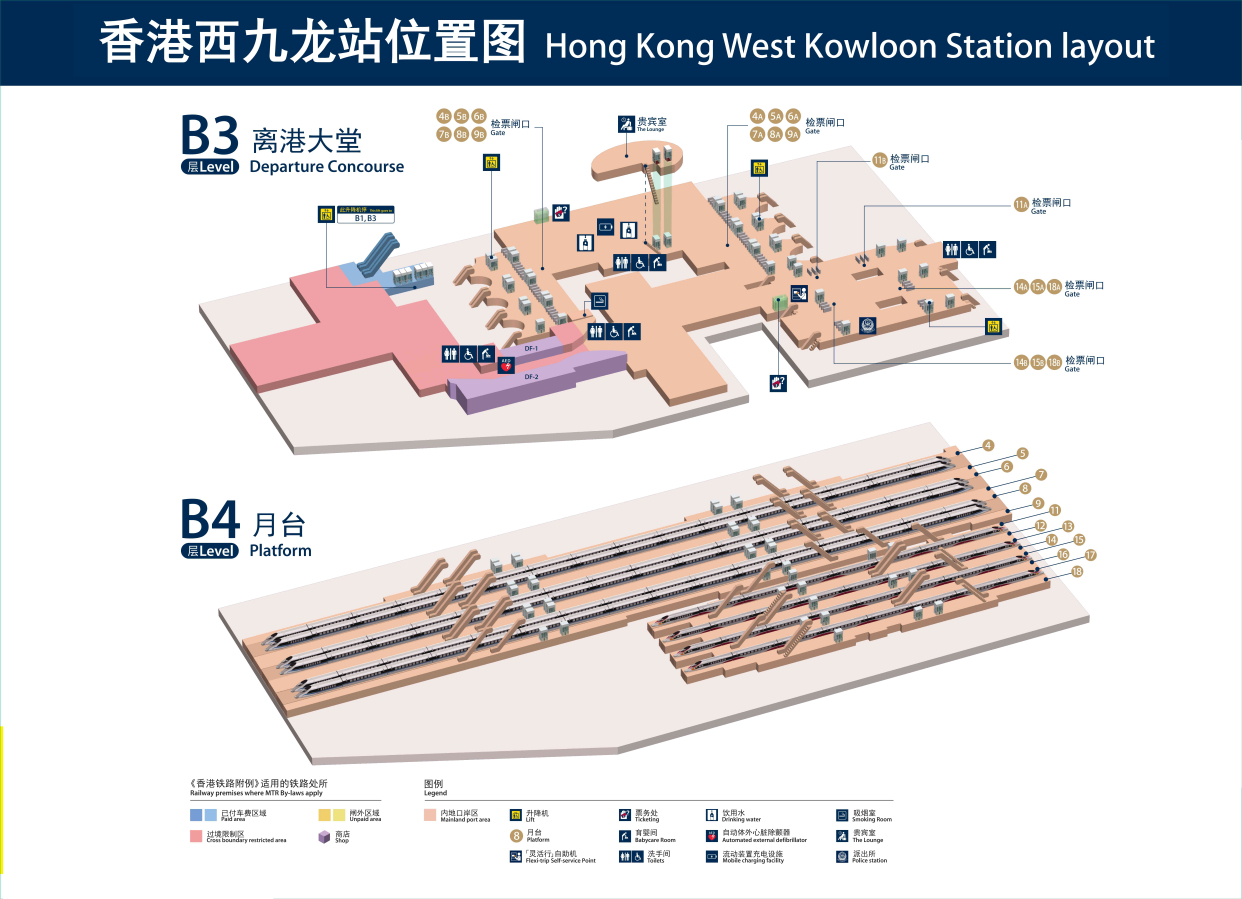 高铁西九龙站共有四层地下楼层,总建筑面积为 38 万平方米。地下一层为售票大厅,地下二层为抵达层,地下三层为离港层,地下四层为列车站台,口岸日设计通关流量为 20 万人次。其中,内地口岸区总建筑面积约 10.9 万平方米,出入境大厅各设置 30 条自助和 18 条人工查验通道;香港口岸区总面积约 2.41 万平方米,入境大厅设置人工柜台 66 个,自助通道 22 条,离境大厅设置人工柜台 32 个,自助通道 29 条。