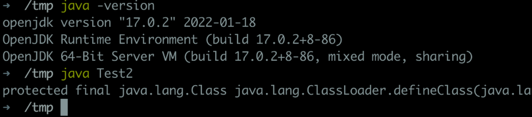 import sun.misc.Unsafe;public class Test2 {public static void main(String[] args) throws Exception {Class clazz = Class.forName("sun.misc.Unsafe");java.lang.reflect.Field f = clazz.getDeclaredField("theUnsafe");f.setAccessible(true);Unsafe unsafe = (Unsafe)f.get(null);Module objectModule = Object.class.getModule();long moduleOffset = unsafe.objectFieldOffset(Class.class.getDeclaredField("module"));unsafe.getAndSetObject(Test2.class, moduleOffset, objectModule);java.lang.reflect.Method method = ClassLoader.class.getDeclaredMethod("defineClass", String.class, byte[].class, int.class, int.class);method.setAccessible(true);System.out.println(method);}}