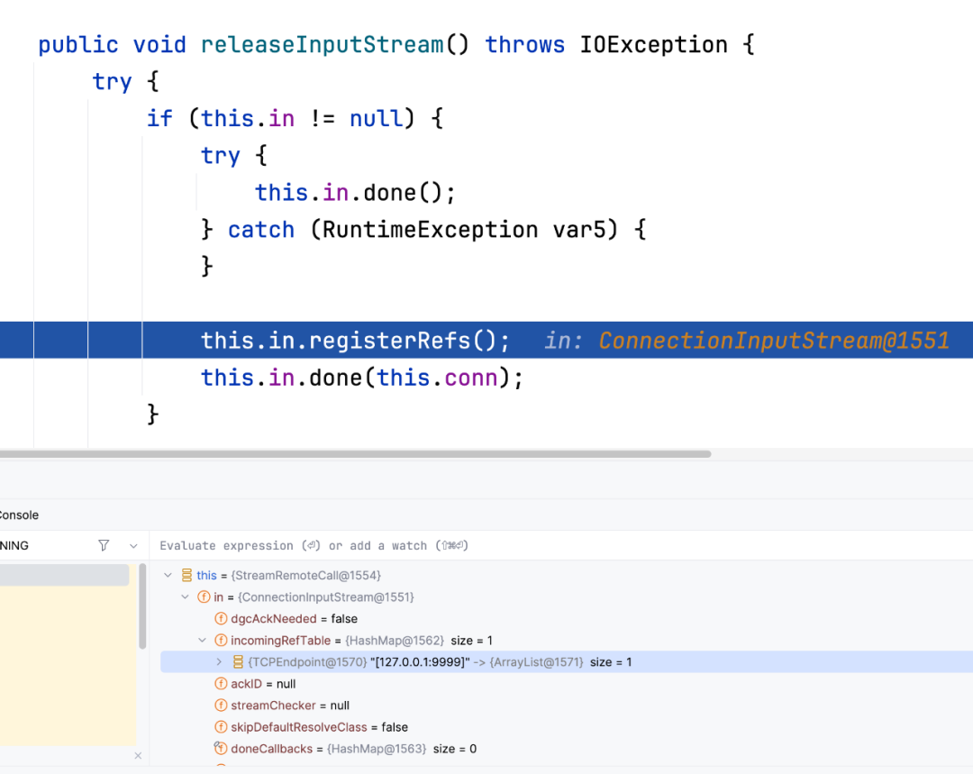 public void releaseInputStream() throws IOException { try { if (this.in != null) { try { this.in.done(); } catch (RuntimeException var5) { } this.in.registerRefs(); this.in.done(this.conn); } this.conn.releaseInputStream(); } finally { this.in = null; }}