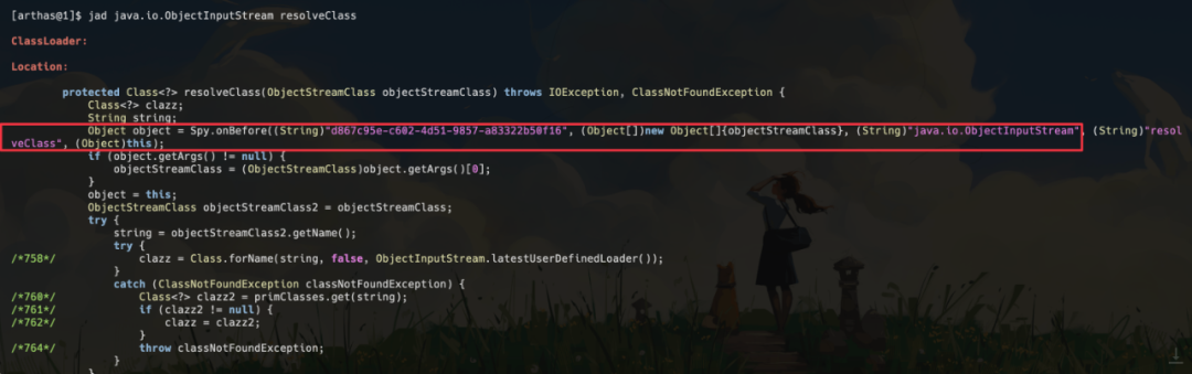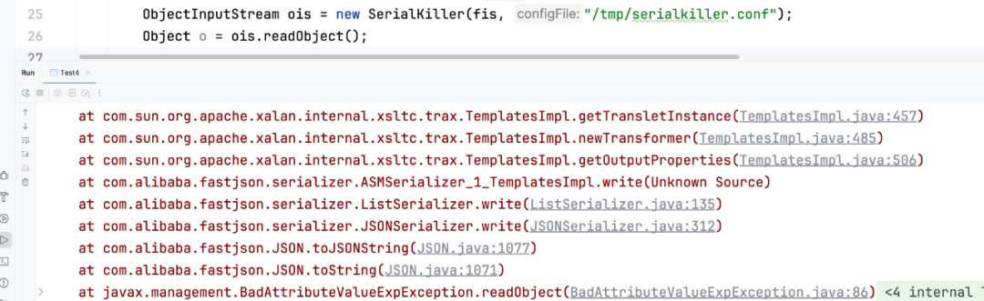 ByteArrayInputStream bais = new ByteArrayInputStream(baos.toByteArray());ObjectInputStream ois = new SerialKiller(bais, "/tmp/serialkiller.conf");ois.readObject();