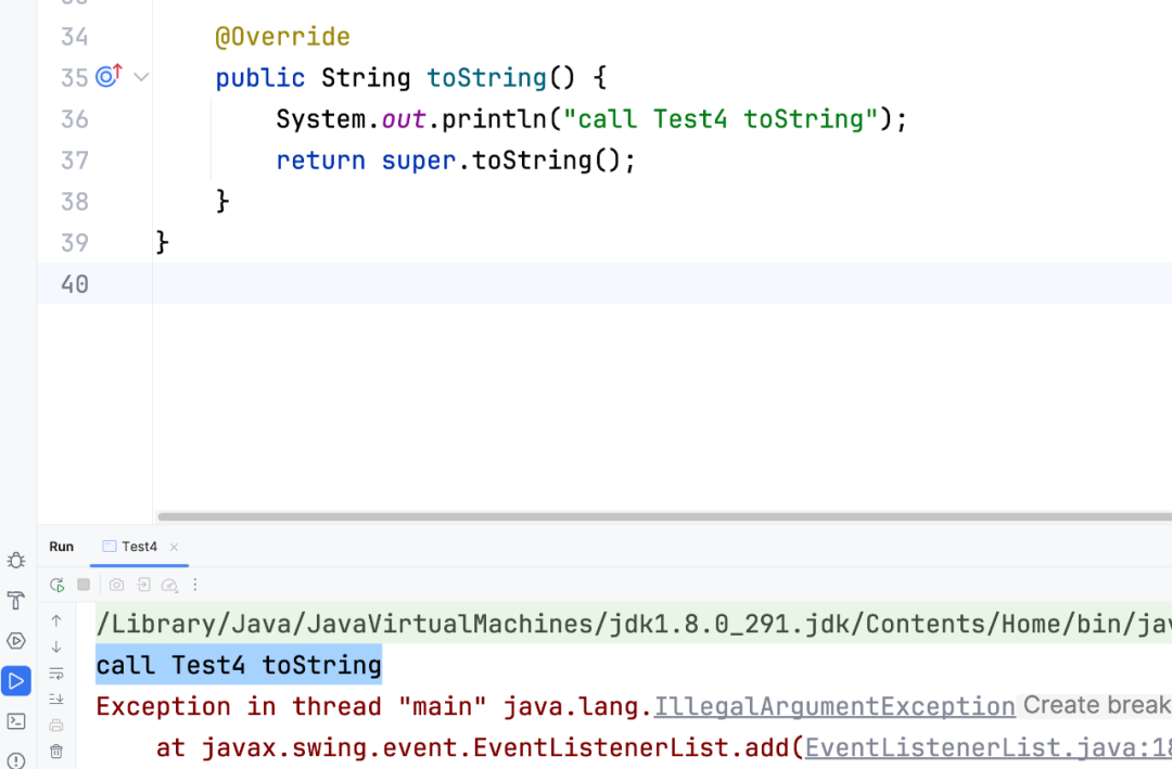 在add方法中,如果l对象不是t类的实例,就会抛出异常,这里字符串拼接了对象l会自动化的调用toString方法,因为有类型转换这里的l只能是实现了EventListener接口的类。