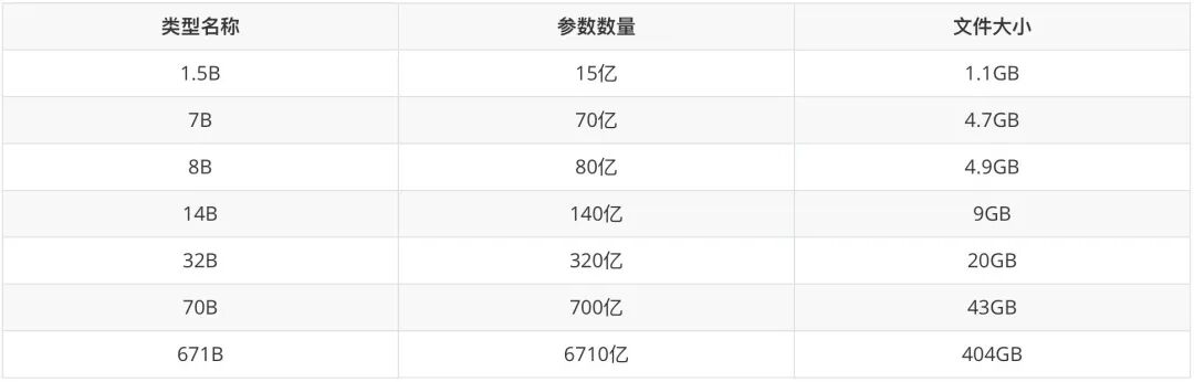 在AI模型中,B代表数字“billion”(十亿),1B等于10亿个参数,671B就表示6710亿个参数,这些模型的参数量越大,所能处理的数据和生成的内容就越复杂,但同时也需要更多的计算资源,更高性能的硬件来运行。每个版本相较于前⼀个版本的计算能力都有显著提升,尤其是从70B 到671B,模型计算能力大幅度提升,能够处理更复杂的上下文和细节问题。