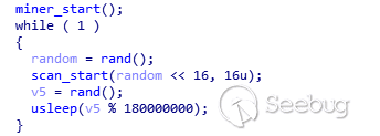 函数scan_start更加有趣,它执行了恶意软件的核心功能。它选择一个随机的16位子网,然后运行Masscan以便在子网中扫描端口2375上的Docker daemons。找到守护程序后,它将使用已下载的Docker CLI工具启动感染过程。