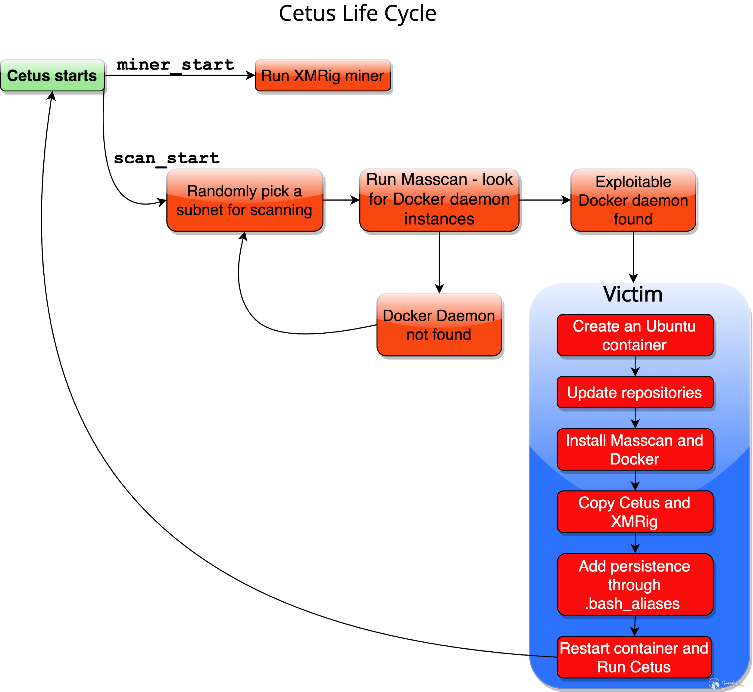 Cetus生命周期从两个功能开始:miner_start和scan_start,它们遵循此处所示的流程。 最后一步是使受害者创建一个Ubuntu容器,更新存储库,安装Masscan和Docker,复制Cetus和XMRig,通过.bash_aliases添加持久性,然后重新启动容器并运行Cetus。