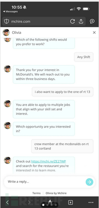 通过https://jobs.mchire.com/访问的McHire平台会引导求职者完成自动化流程,包括Traitify.com的性格测试。申请者与Olivia交互时需提供联系方式及班次偏好。