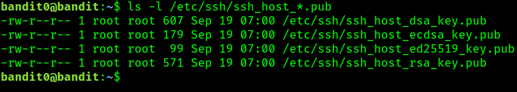 After typing in the following command, it will prompt for the password. This is an entry level, so password is given by the bandit team – bandit0. Once you type this, and if this is the first time, it will prompt for saving the key fingerprint.