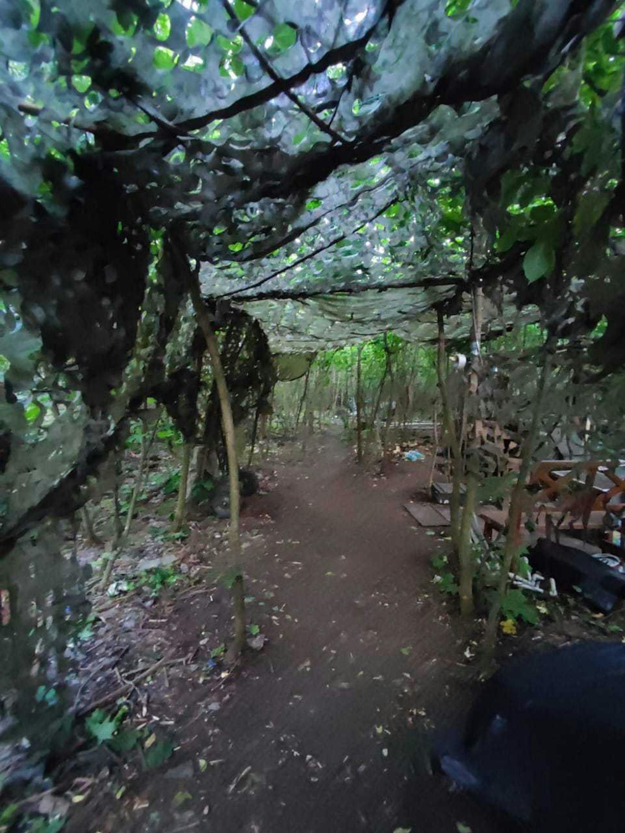 Our defenses included a large number of camouflage nets, carefully draped over our position. We also made small holes in the ground for storing equipment and tried to hide our traces as best as possible. We even “planted” makeshift trees—small fallen branches and logs pulled from nearby—raising them with ropes to create additional shade and concealment.