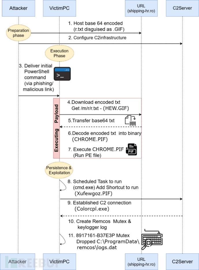 下载解码后的载荷会以程序信息文件(.PIF)形式启动,这是一种常用于旧版程序的可执行文件类型。攻击者将其伪装成"CHROME.PIF"仿冒合法程序。最终阶段将安装REMCOS后门,使攻击者完全控制受害系统。该恶意软件还会在%ProgramData%目录下创建Remcos文件夹存放键盘记录日志,确保自身持久化驻留。