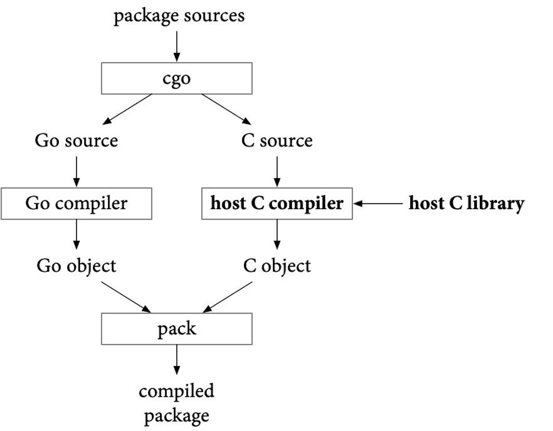 Host C toolchain. Some Go packages, most notably net, default to using cgo on most operating systems. In some cases, such as macOS and Windows, invoking system DLLs using cgo is the only reliable way to resolve host names. When we use cgo, though, we invoke the host C toolchain (meaning a specific C compiler and C library), and different toolchains have different compilation algorithms and library code, producing different outputs. The build graph for a cgo package looks like: